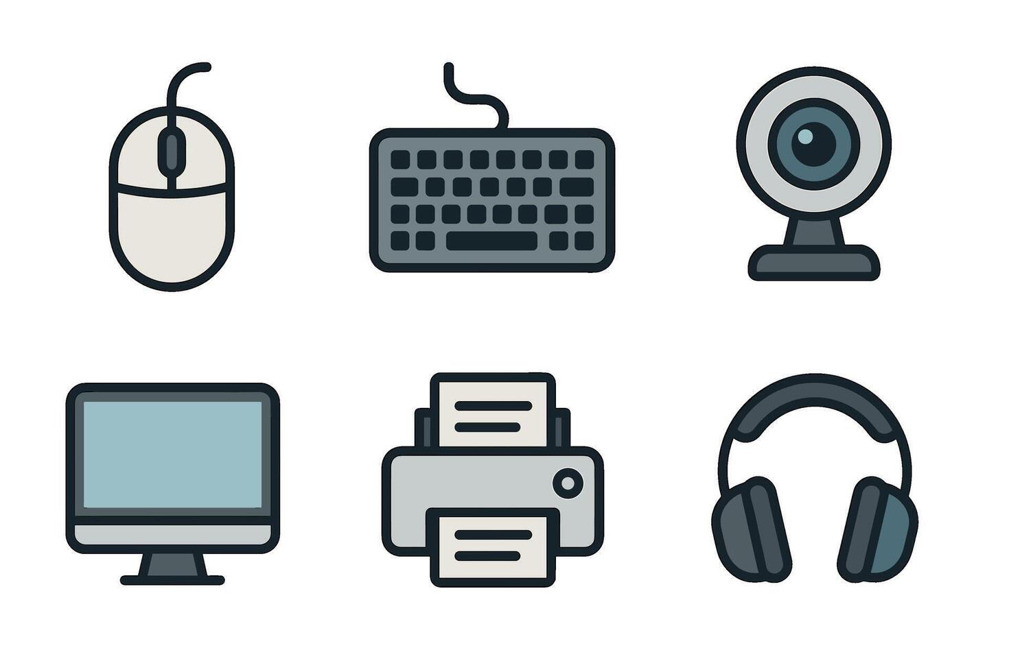 Computer peripherals and office equipment icon set. Collection of mouse, keyboard, monitor, and printer symbols. Pro Vector
