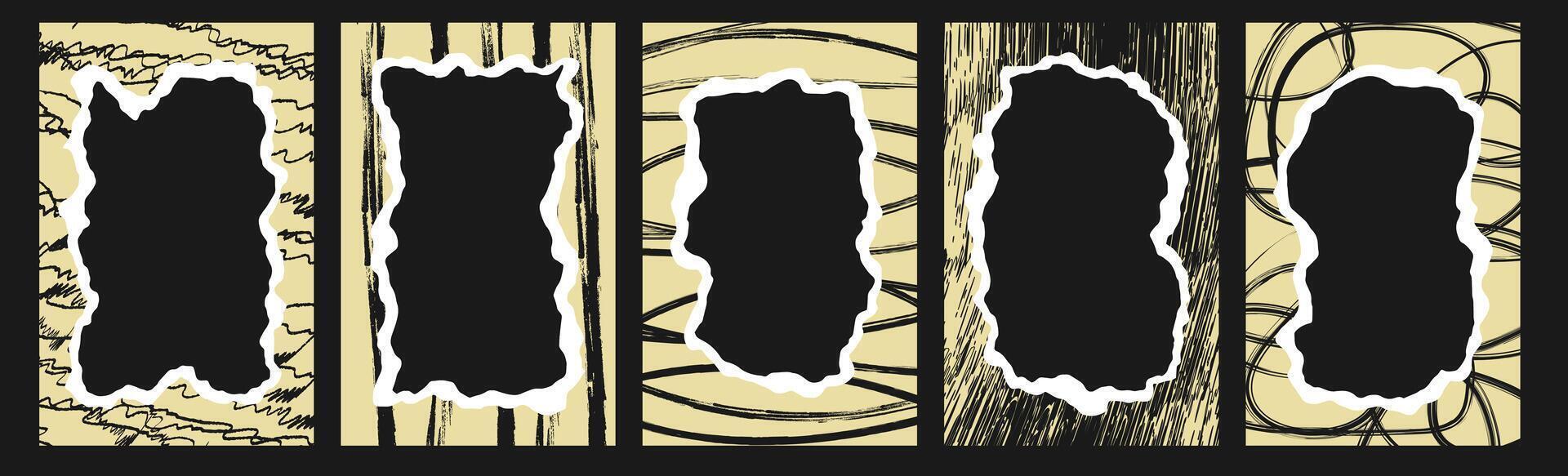 Set of cut out paper frames elements. Collage scrapbook borders with crayon drawn doodles and patterns. Black ink elements Pro Vector