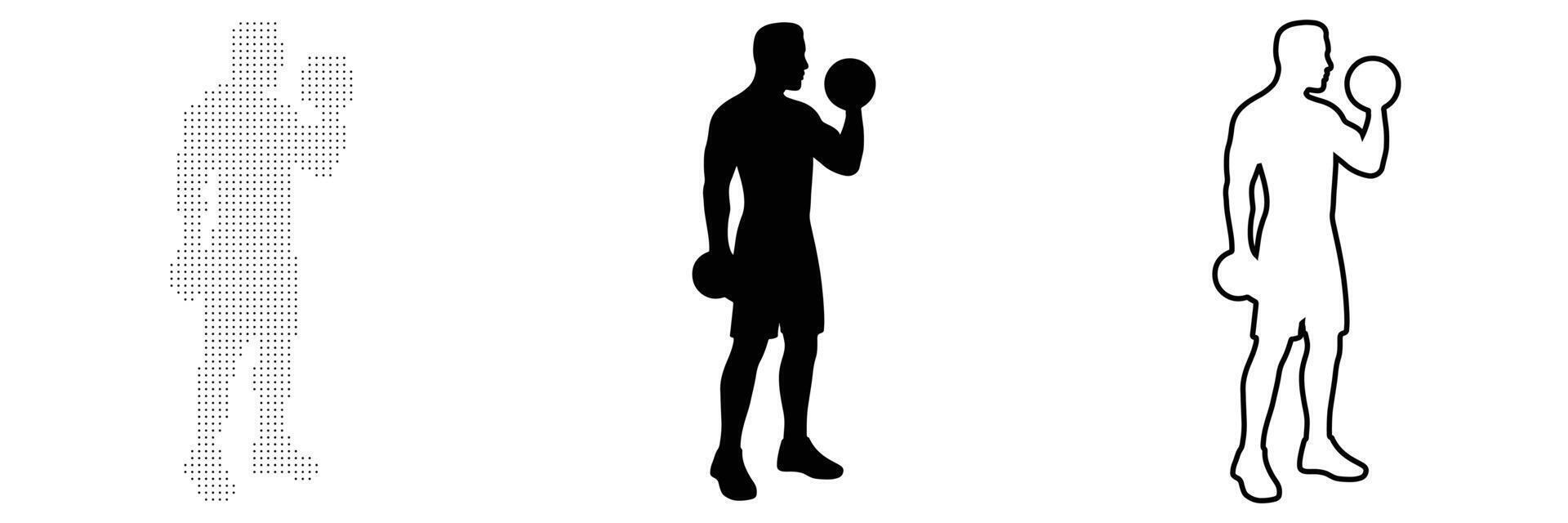 Dumbbell Curl Pose in Three Graphic Styles Solid Silhouette, Dotted Figure, and Outline Drawing Pro Vector
