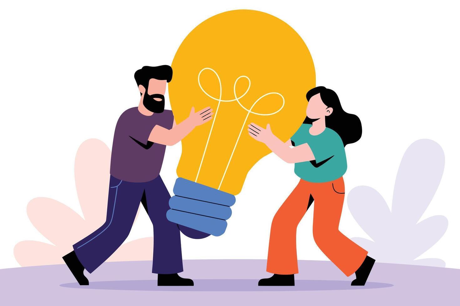 Two people carrying a large light bulb with a drawing of a brain inside it together in a minimalist style with soft background Pro Vector