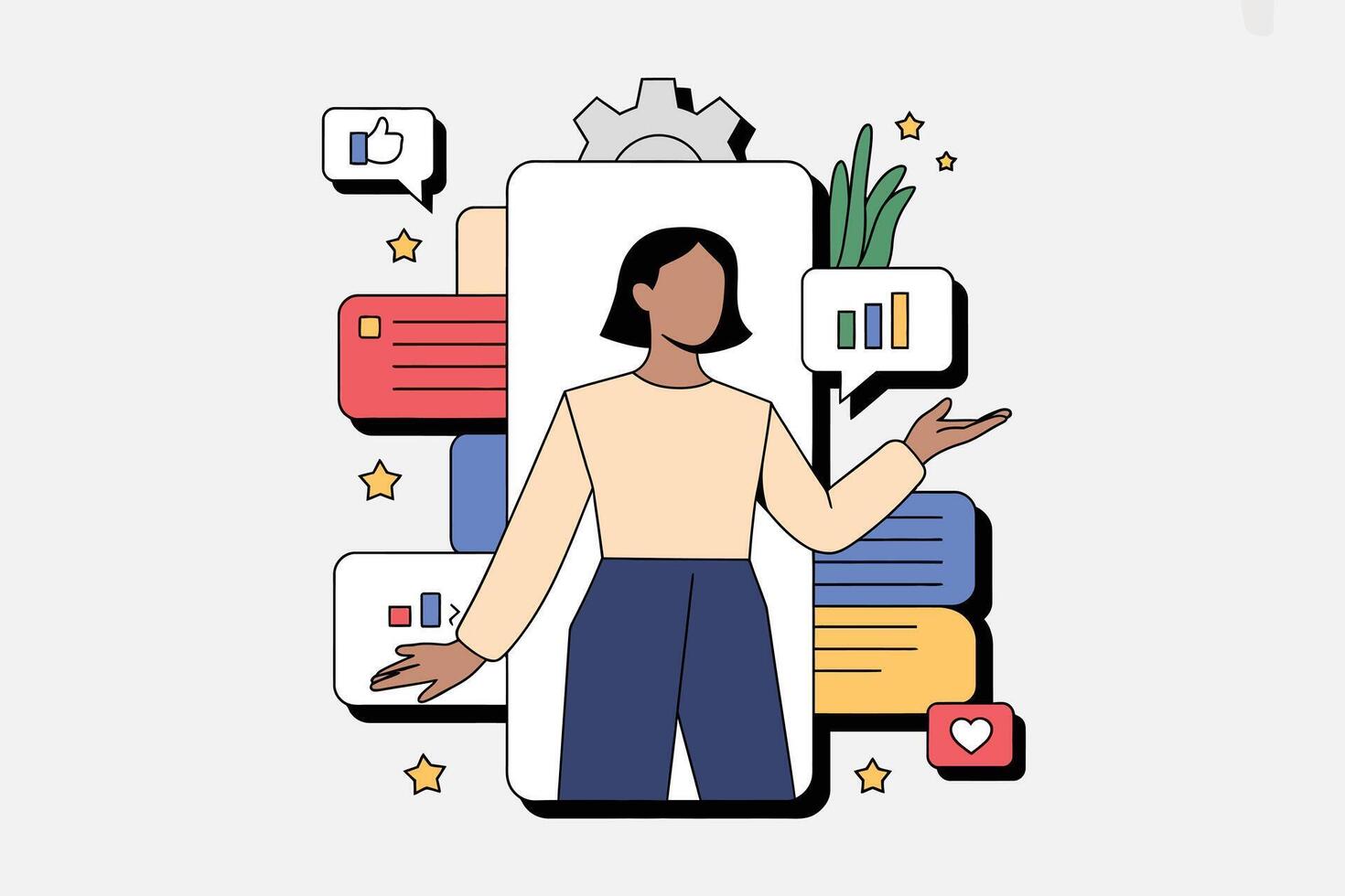 Woman presenting data analytics with charts and graphs on digital screens surrounded by social media icons and office elements Pro Vector