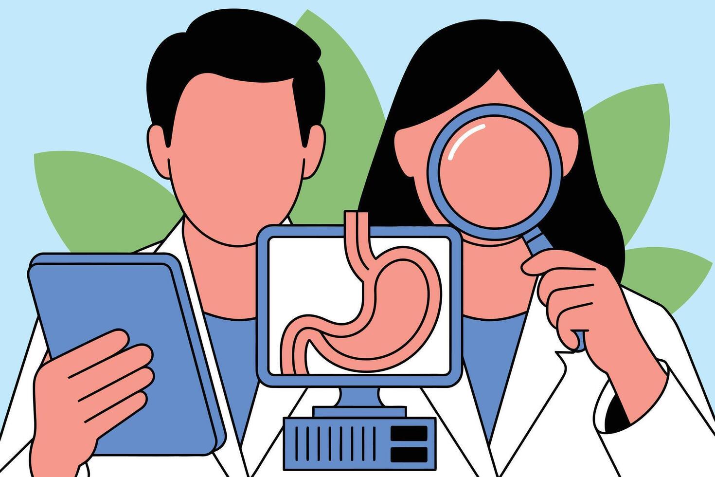 Medical professionals examining digestive system on computer screen with tablet and magnifying glass in laboratory setting Pro Vector