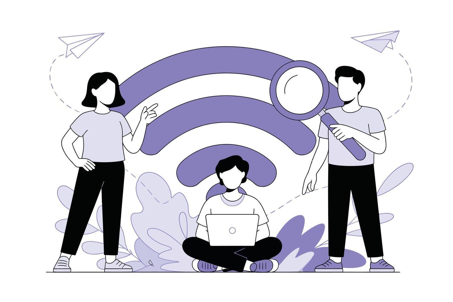 People working with laptop and magnifying glass on wireless network background with abstract shapes and paper planes Pro Vector