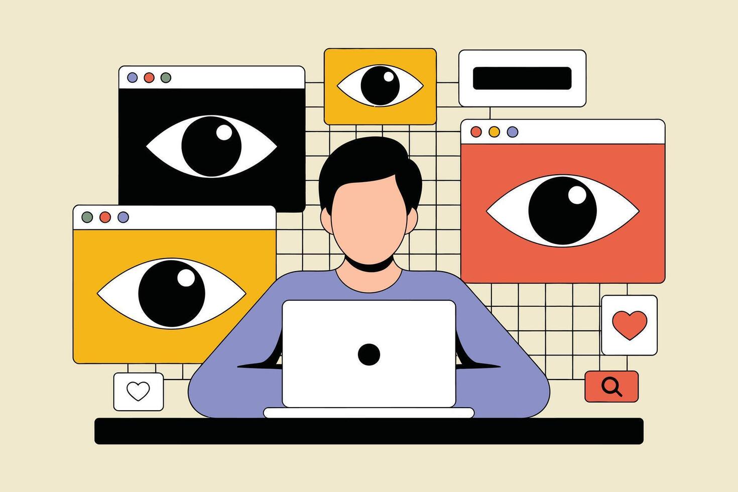 Person using laptop surrounded by large eyes on computer screens in a grid background with social media icons Pro Vector