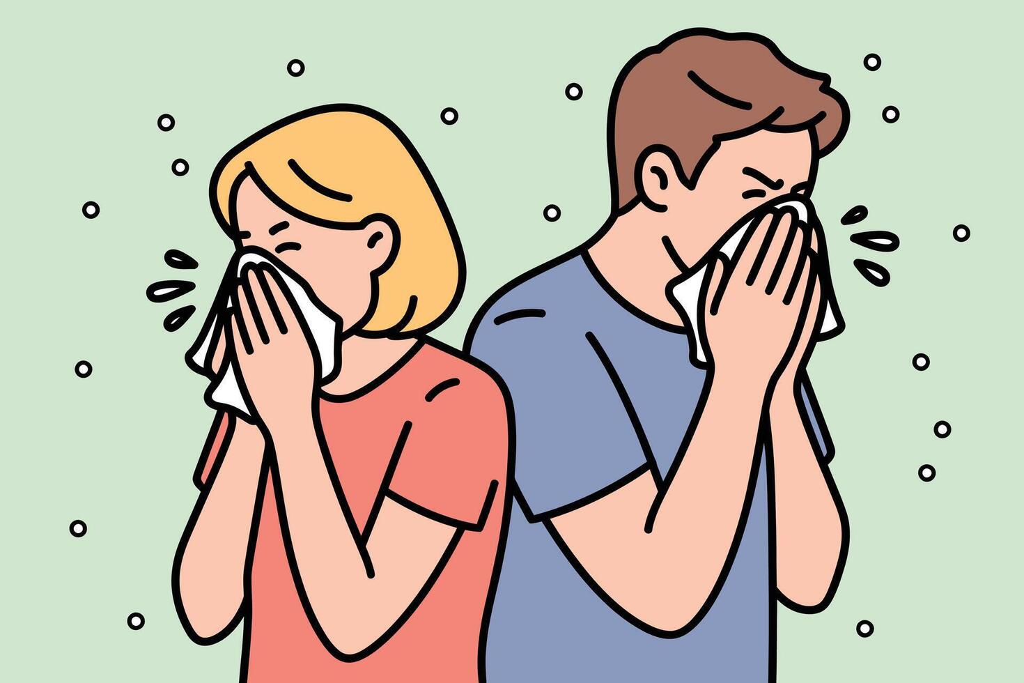 Two people sneezing into tissues together with visible particles in the air on a light green background Pro Vector