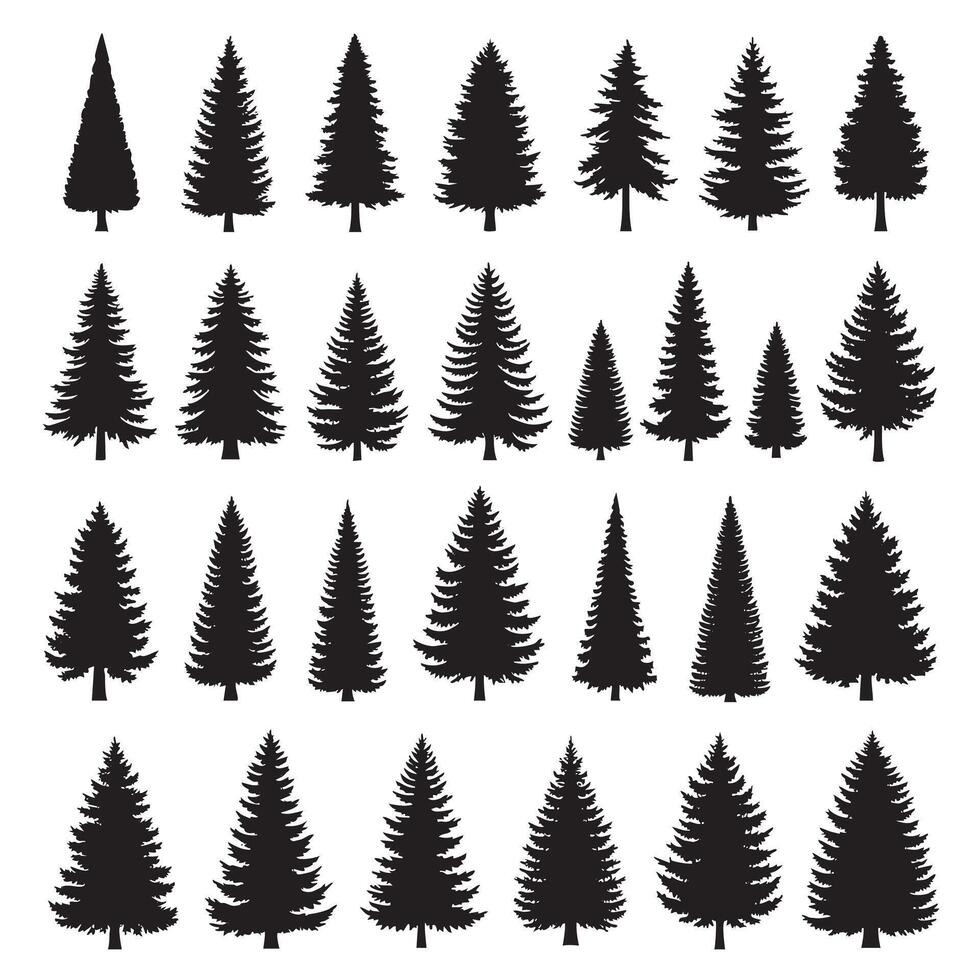 Black silhouettes of various pine trees arranged in a grid pattern on a white background Pro Vector