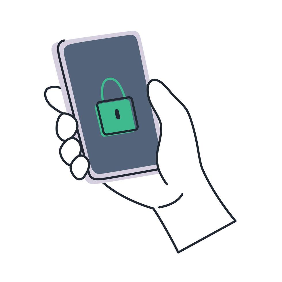 Flat cartoon illustration of hand holding smartphone with lock icon on screen, digital security concept, data protection and safe access, modern style for apps, privacy and technology projects Pro Vector