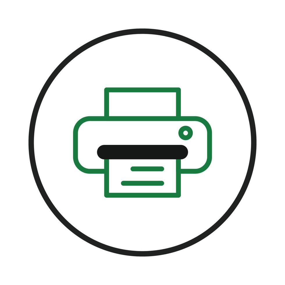 Stylized printer icon illustration showing a device releasing a document within a circular format vector