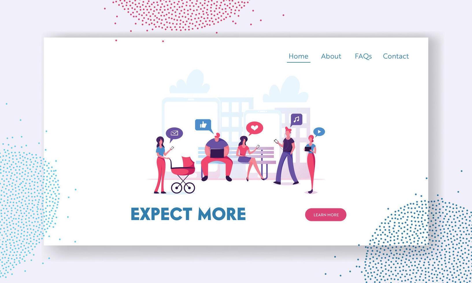 Social Networking Website Landing Page, Characters Communication via Internet on Cityscape Background. Chat, News, Messages Pro Vector