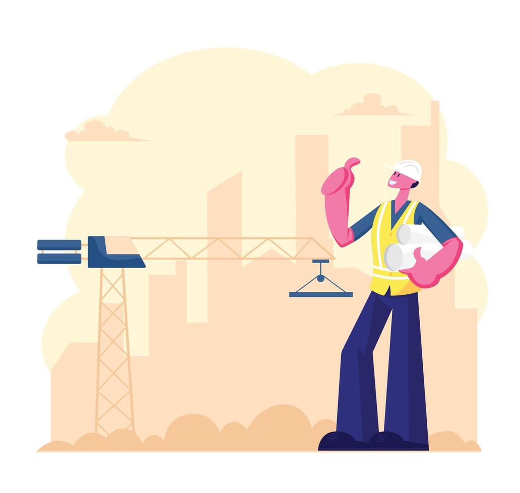 Architect or Engineer Worker Wearing Helmet Holding Project Blueprint Stand at Building Site with Working Crane. Builder Pro Vector