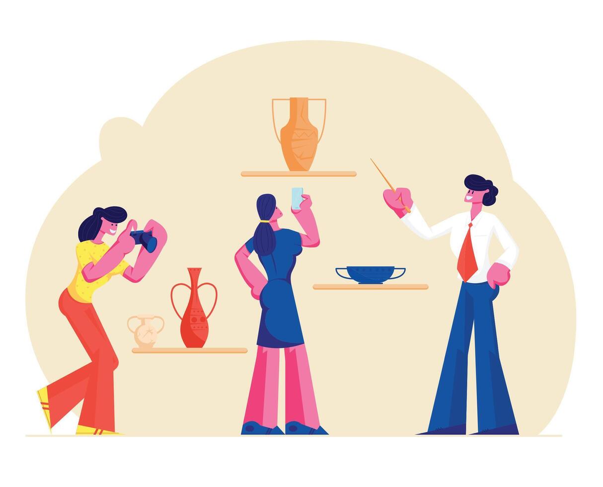 Group of Tourists Visiting Museum of Ancient History Watching and Photographing Old Vases. Guide Man Tell Lecture with Pointer Pro Vector