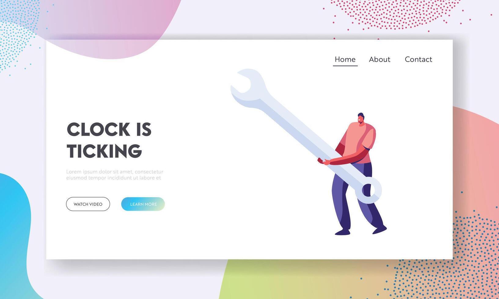 Technical Support Service Website Landing Page, Tiny Man Characters Holding Huge Wrench, Character with Repair Instrument Pro Vector