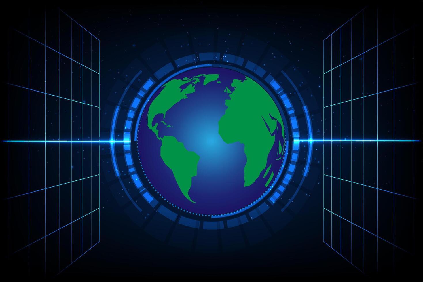 Abstract digital globe with glowing data rings and global network lines, representing technology, communication and innovation Pro Vector