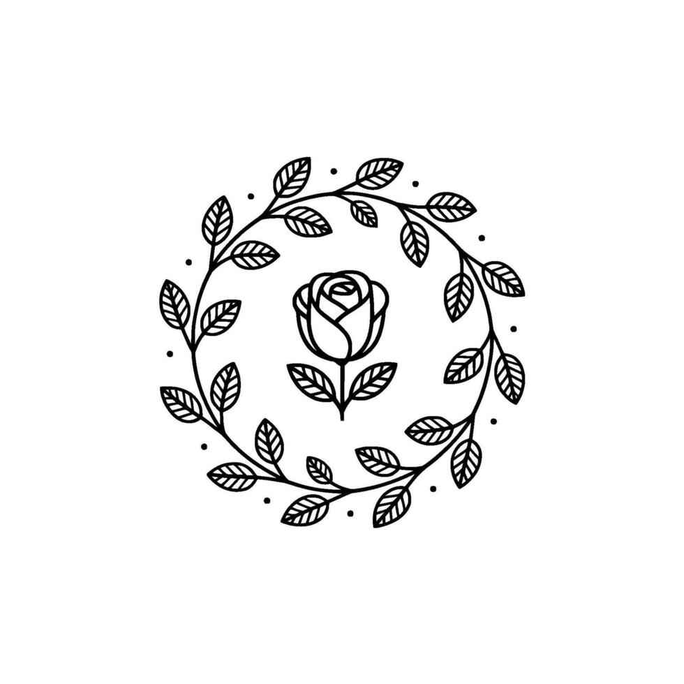Elegant minimalist line art illustration of a single rose bloom centered within a circular floral wreath of delicate leaves and tiny dots on a clean background Pro Vector