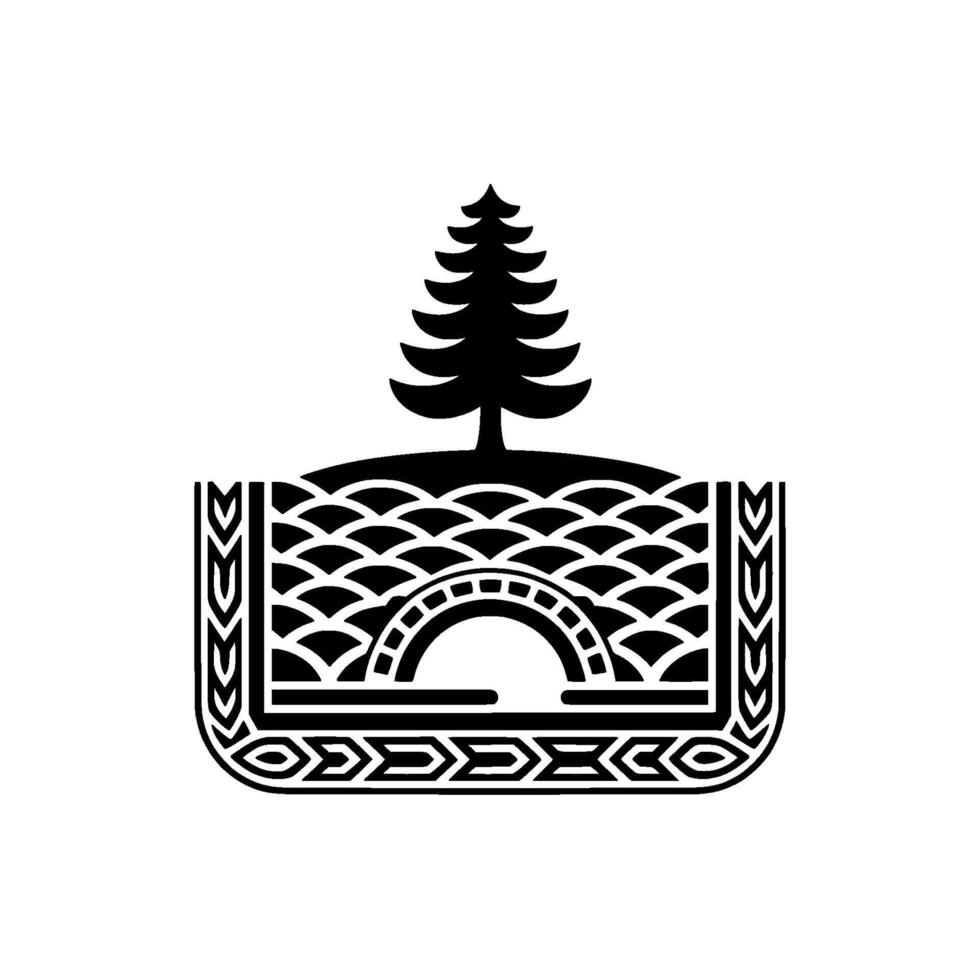 Stylized silhouette featuring a solitary evergreen tree atop a rounded hill above a decorative arched bridge with intricate geometric patterns and scalelike textures Pro Vector