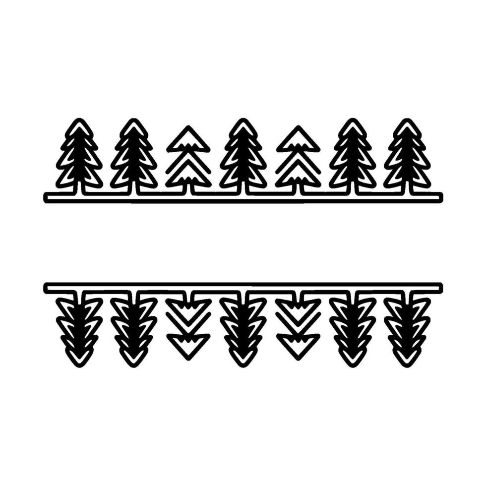 A pair of horizontal line art borders featuring stylized evergreen trees and downward pointing arrow shapes Pro Vector