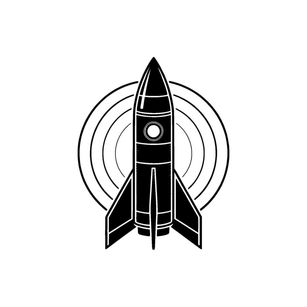 A bold illustration of a retro styled rocket ship launching with concentric circular sound waves emanating behind it Pro Vector