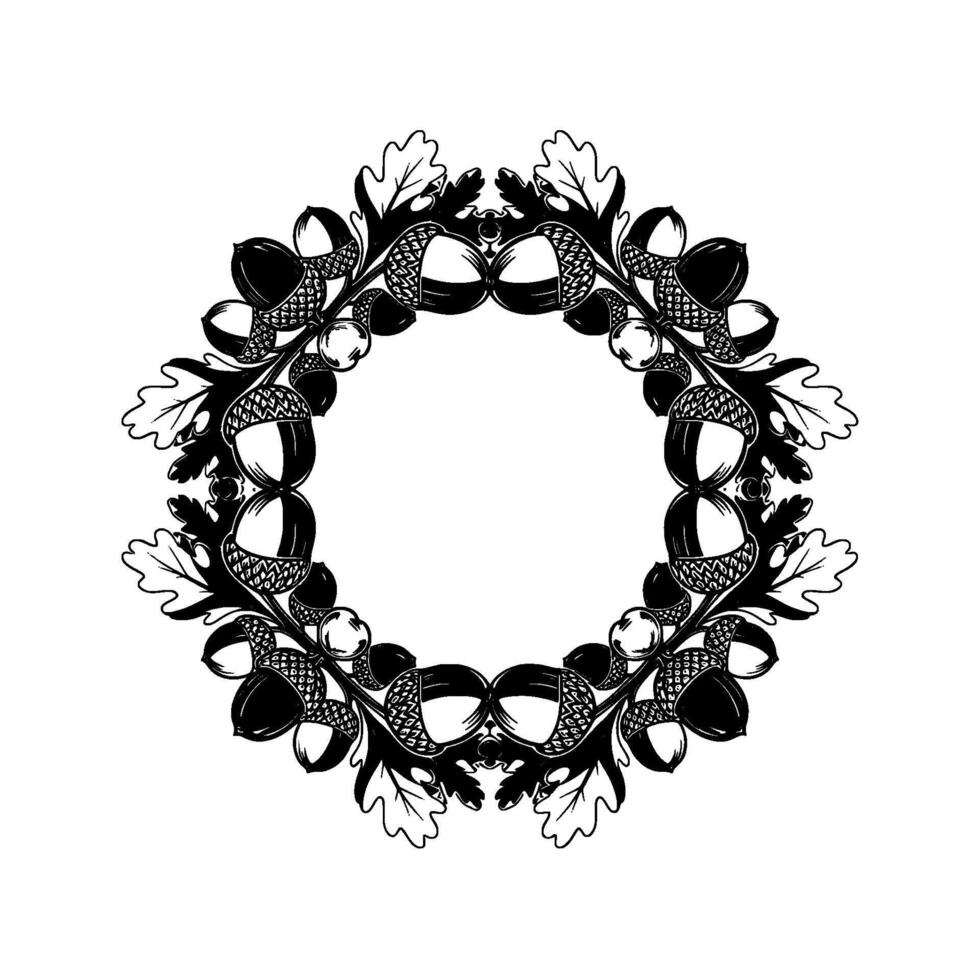 Intricate illustration of a circular wreath composed of detailed oak leaves and acorns arranged in a repeating pattern Pro Vector