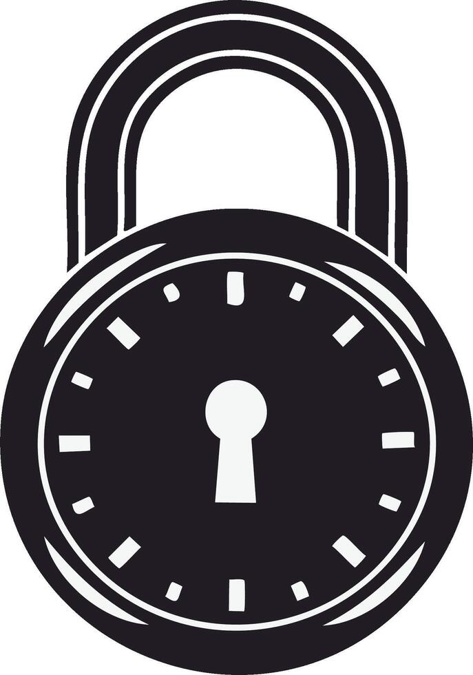 A simple graphic of a black padlock with a combination dial and keyhole on a plain background Pro Vector