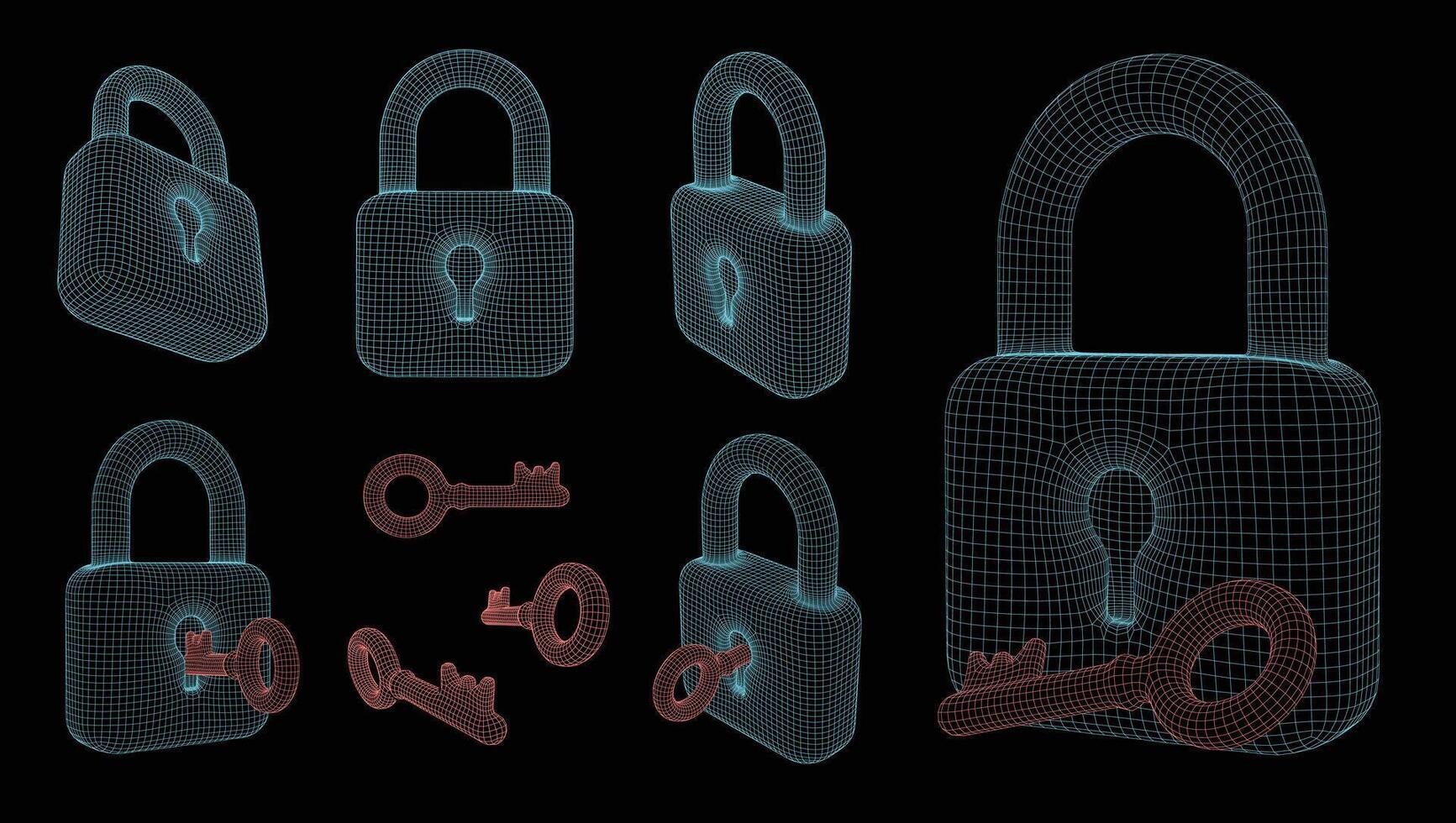 3D wireframe padlock and key set. Neon blue glowing grid structure on black background. Cyber security, digital encryption, data protection, and futuristic technology concept. Blockchain safety Pro Vector
