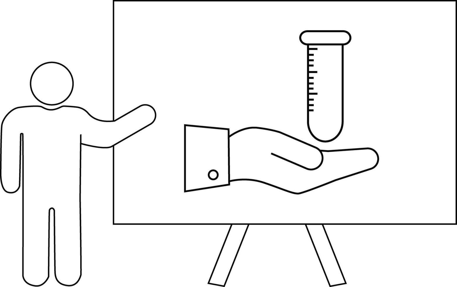 Presentation Stick figure points to whiteboard with test tube over open hand Pro Vector