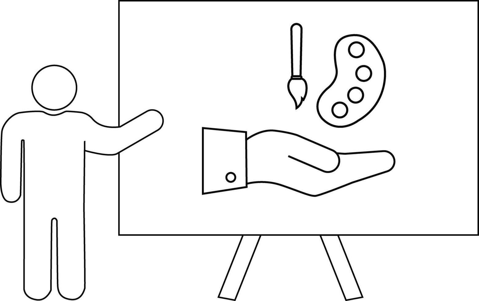 Drawing of a person next to a canvas stand showing a hand with a paintbrush and a palette Pro Vector