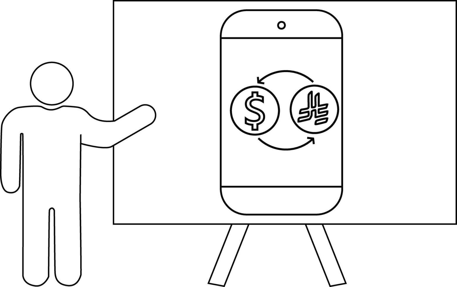 Presentation A person stands next to a screen showing a phone with currency exchange symbols Pro Vector