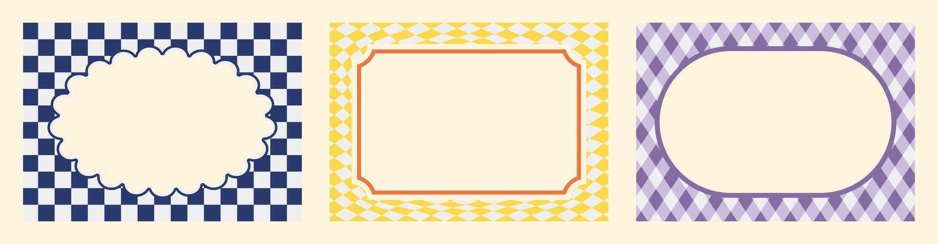 Pack of funky abstract border frames with distorted wavy and liquid grid patterns for groovy 90s style poster Pro Vector