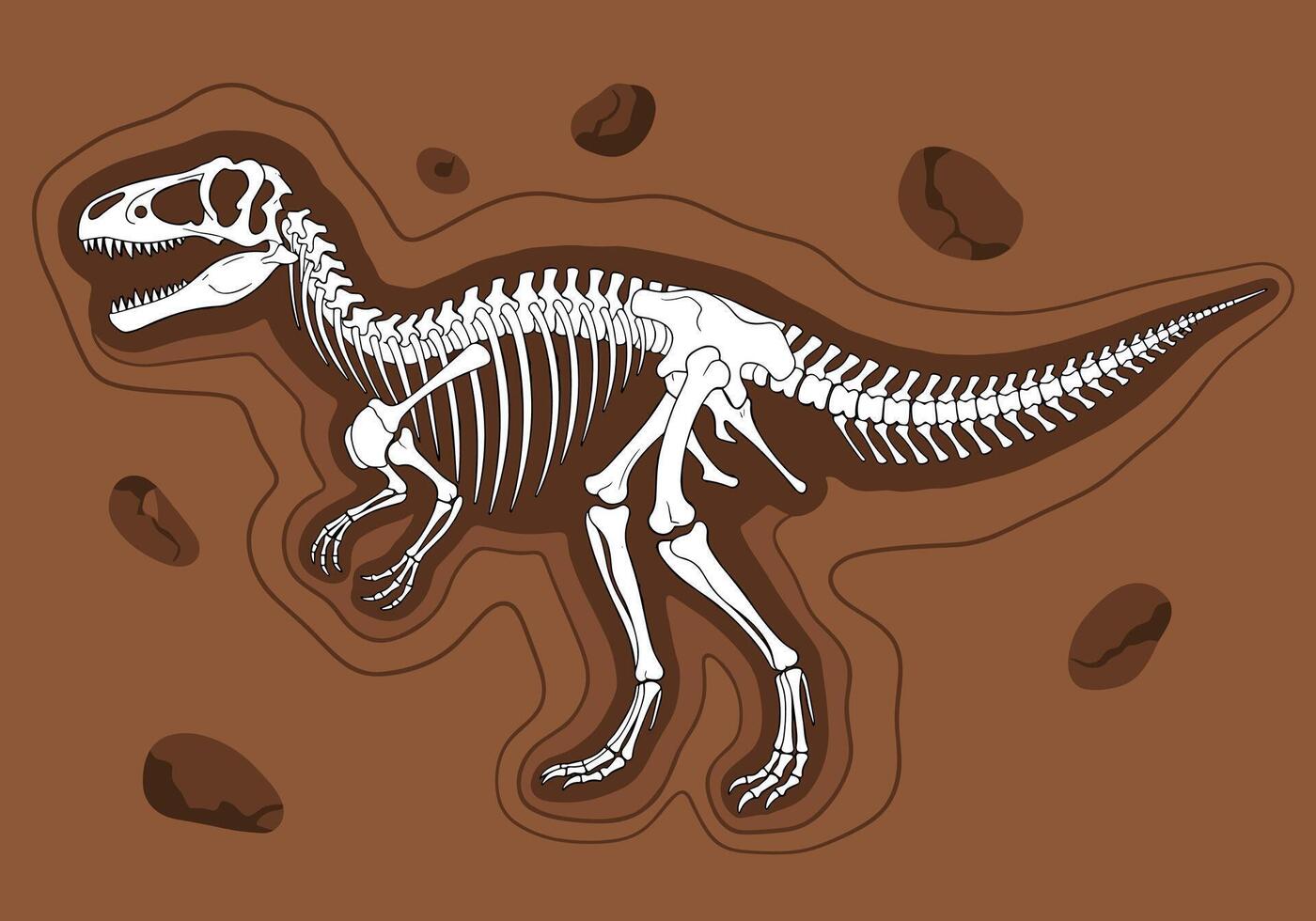 Full dinosaur skeleton fossil embedded in soil with rocks, illustrating a prehistoric archaeological excavation site. Pro Vector
