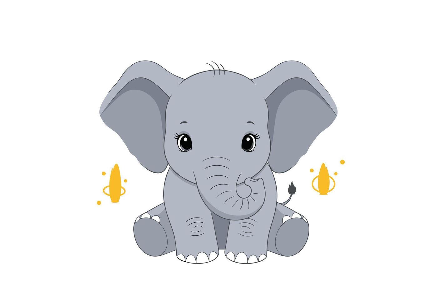 Adorable grey baby elephant sits calmly with its trunk curled up and yellow decorative elements on either side of the character. Pro Vector