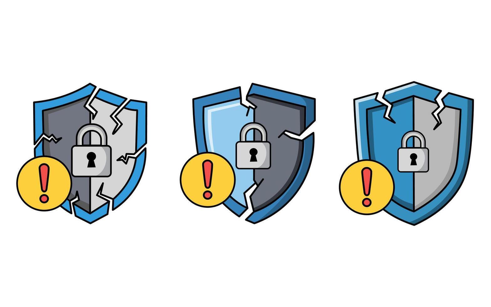 Security Shields with Padlocks and Warning Signs Showing Vulnerability Pro Vector