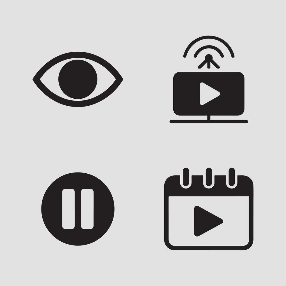 A collection of essential media control and viewing icons, including eye, live stream, pause, and scheduled Pro Vector