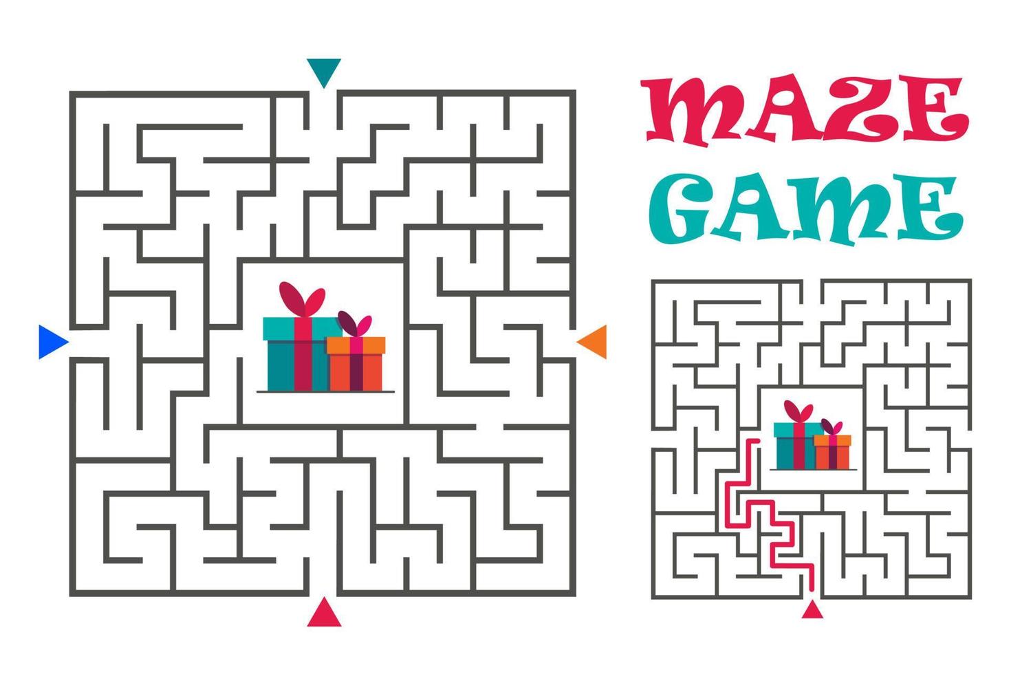 Square maze labyrinth game for kids. Labyrinth logic conundrum. Four entrance and one right way to go. Vector flat illustration isolated on white background. Pro Vector