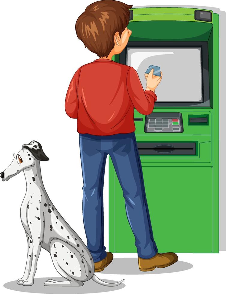 Man withdraw money from atm machine with a dog vector