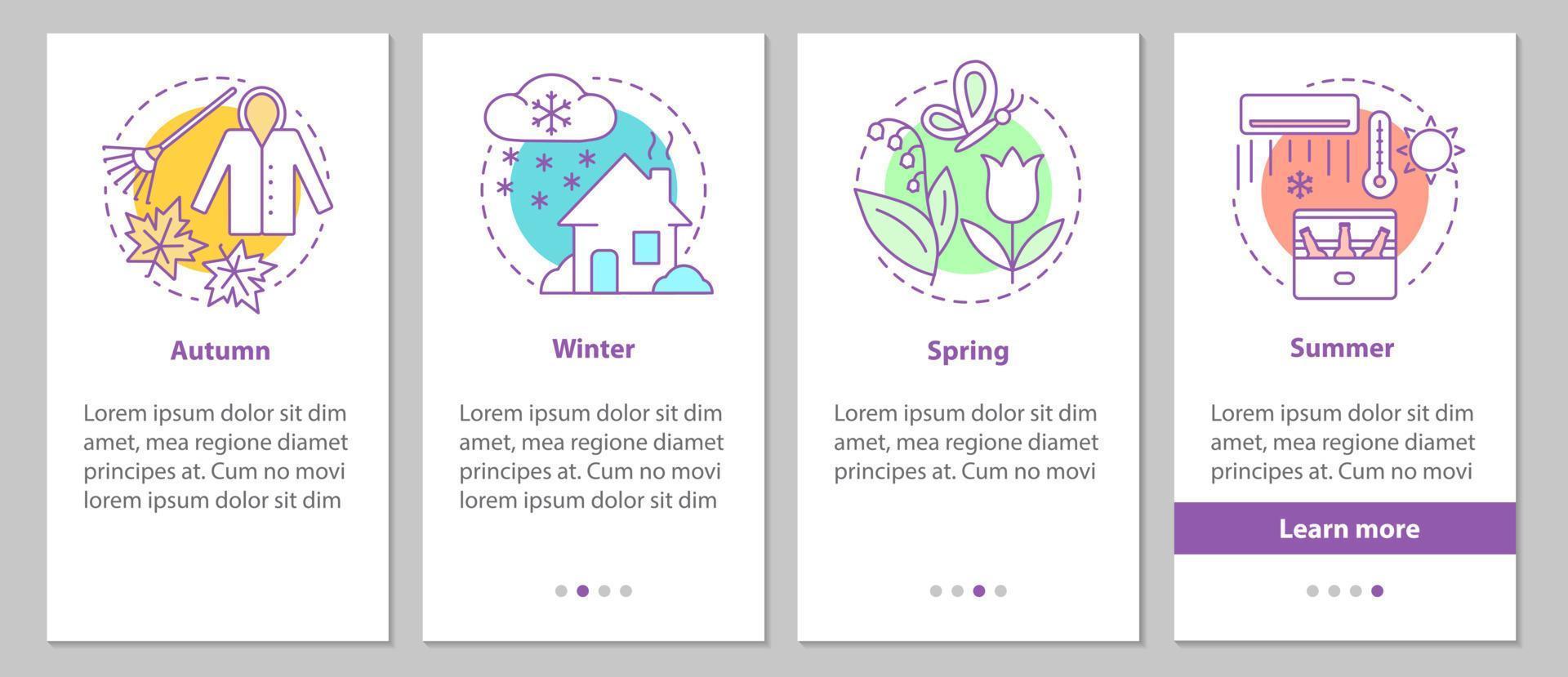 Four seasons onboarding mobile app page screen with linear concepts. Winter, autumn, spring, summer steps graphic instructions. UX, UI, GUI vector template with illustrations Pro Vector