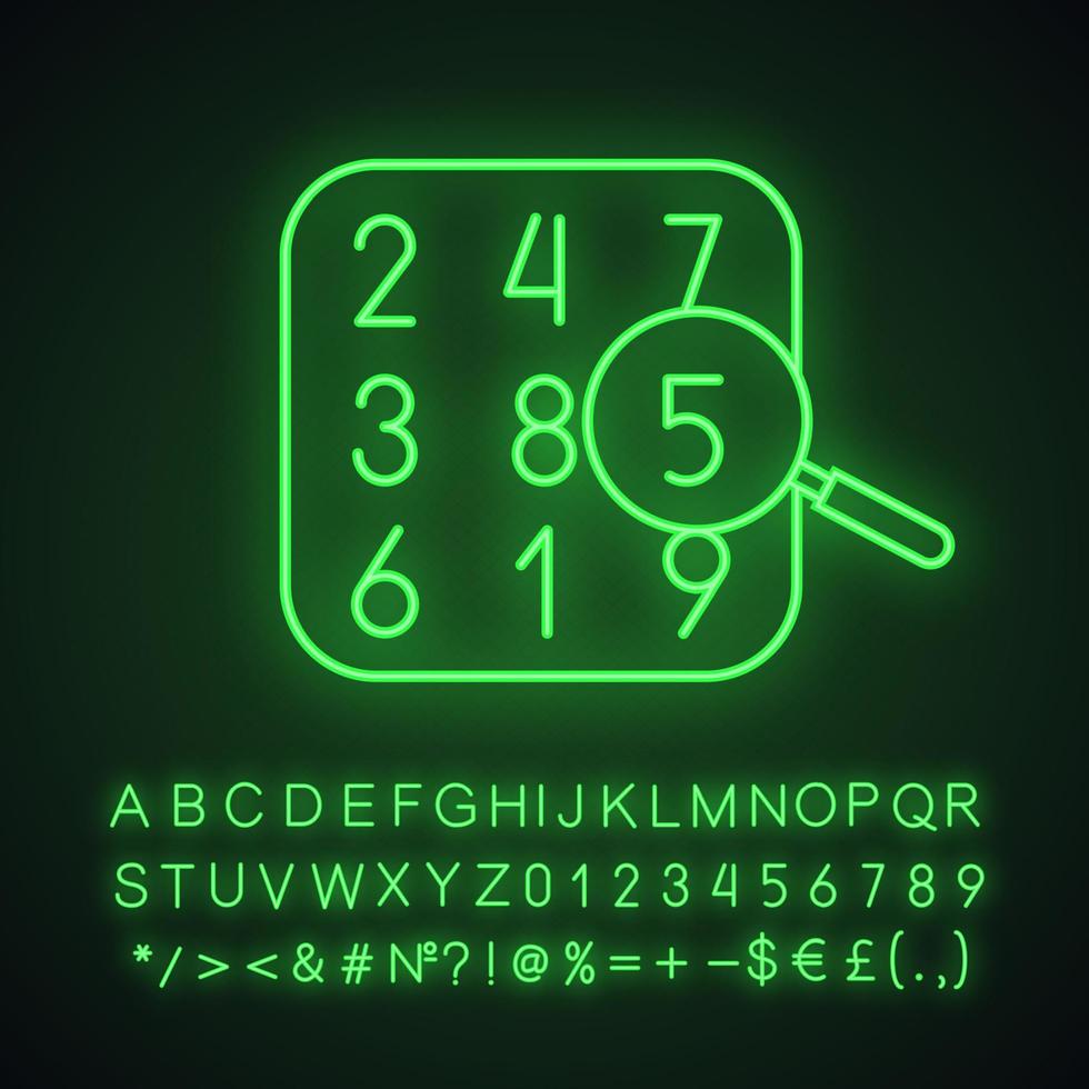 Number theory neon light icon. Arithmetic. Learning number and counting. Glowing sign with alphabet, numbers and symbols. Vector isolated illustration Pro Vector