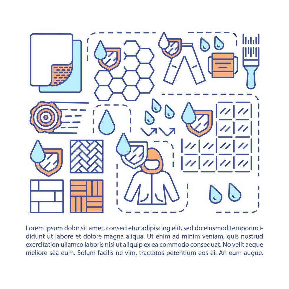 Waterproof materials article page vector template. Brochure, magazine, booklet design element with linear icons and text boxes. Rainproof clothes. Print design. Concept illustrations with text space Pro Vector