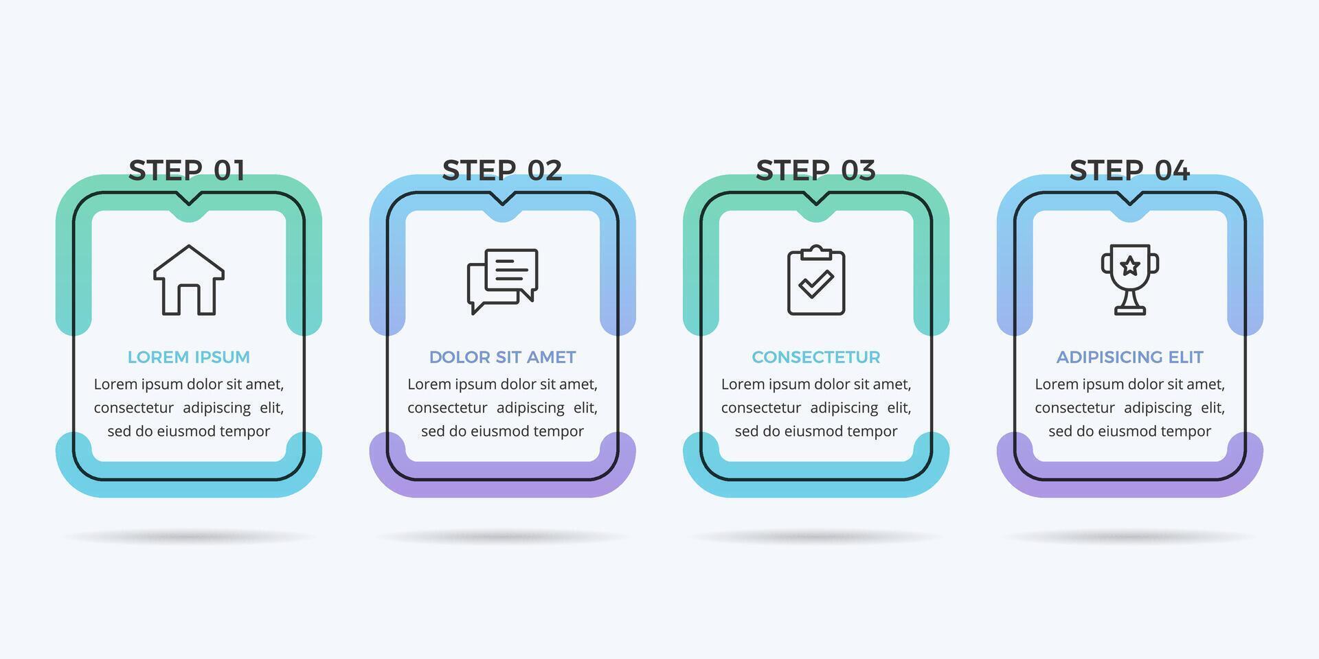 Horizontal four step process infographic layout with rectangular gradient frames Pro Vector