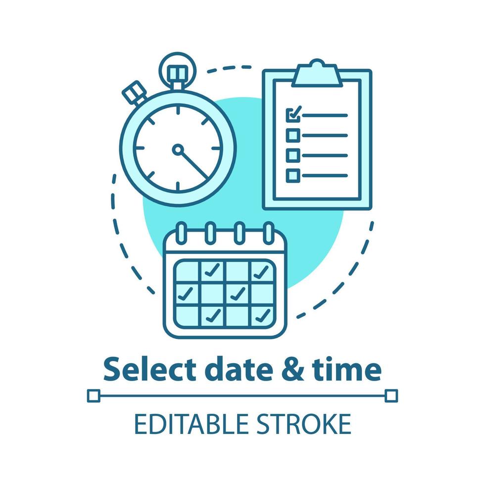 Select date and time concept icon. Choose day, hour thin line illustration. Making reservation. Time management, scheduling. Calendar, stopwatch. Vector isolated outline drawing. Editable stroke Pro Vector