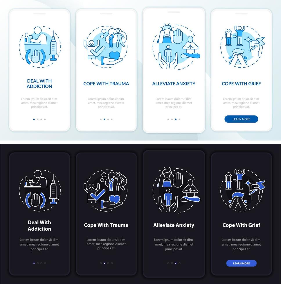 Emotional support night and day mode onboarding mobile app screen. Walkthrough 4 steps graphic instructions pages with linear concepts. UI, UX, GUI template Pro Vector
