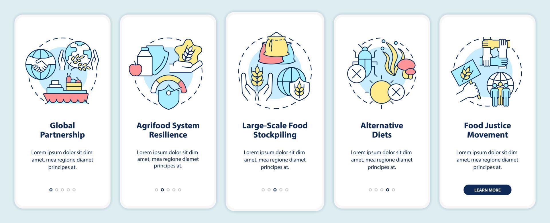 Food security approaches onboarding mobile app screen. Walkthrough 5 steps graphic instructions pages with linear concepts. UI, UX, GUI template. Pro Vector