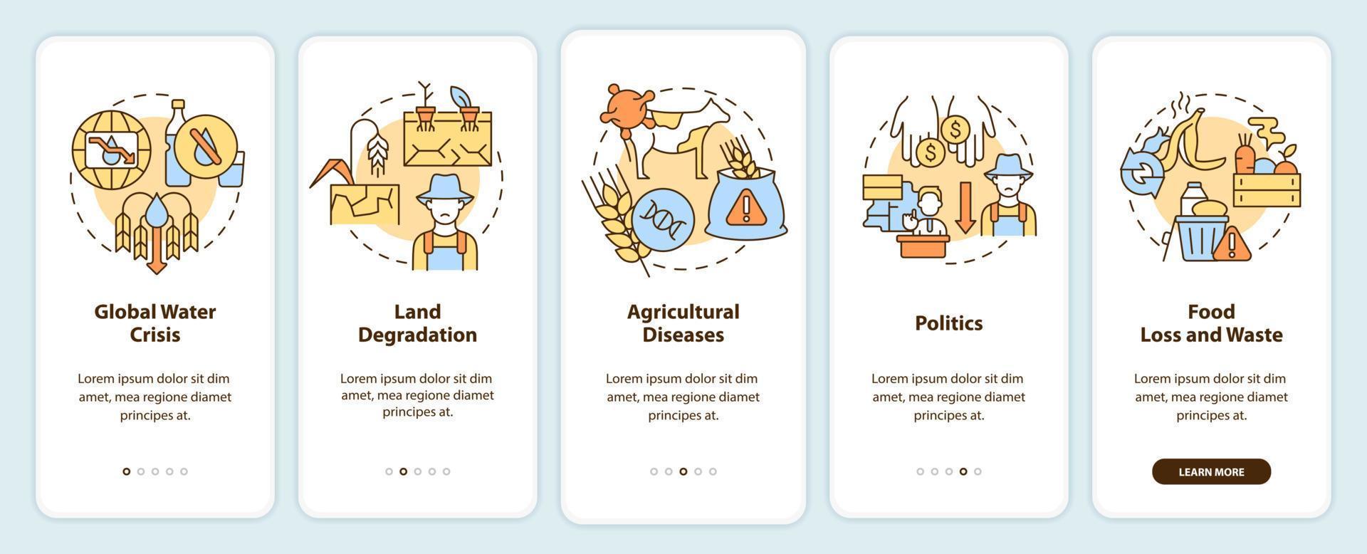 Challenges to achieving food security onboarding mobile app screen. Walkthrough 5 steps graphic instructions pages with linear concepts. UI, UX, GUI template. Pro Vector
