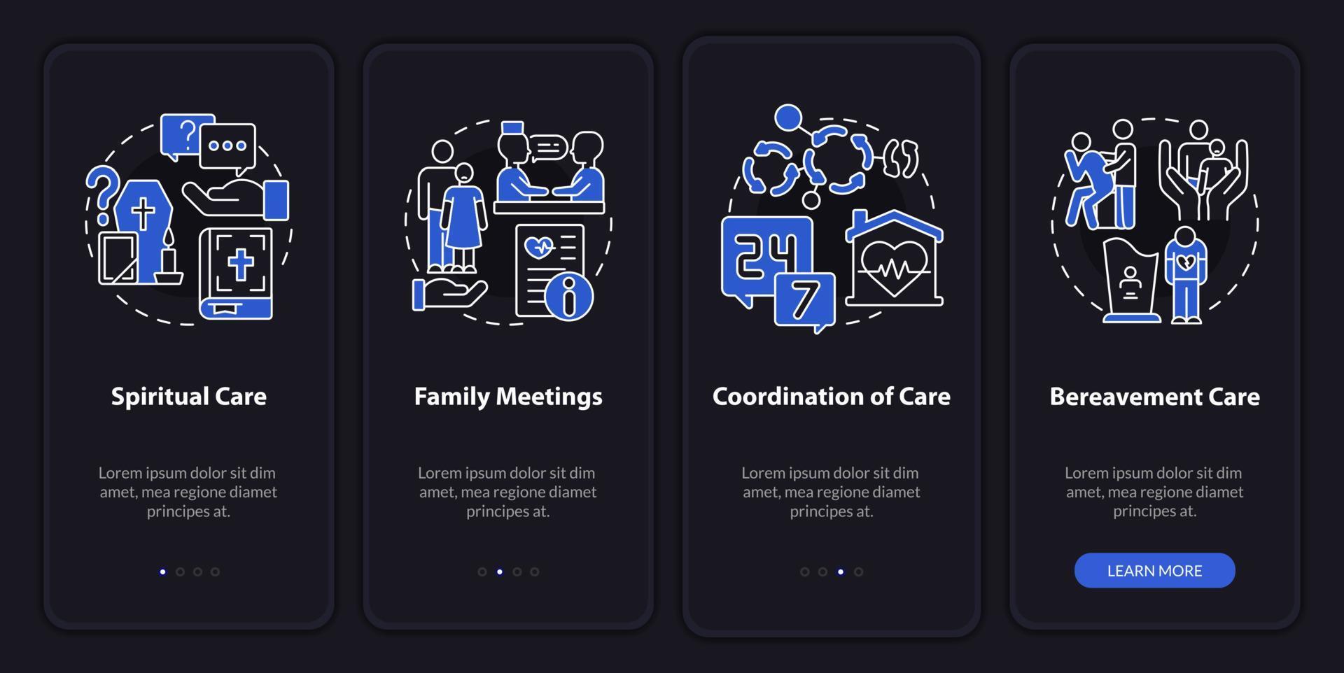 Hospice care night mode onboarding mobile app screen. Medical service walkthrough 4 steps graphic instructions pages with linear concepts. UI, UX, GUI template. Pro Vector