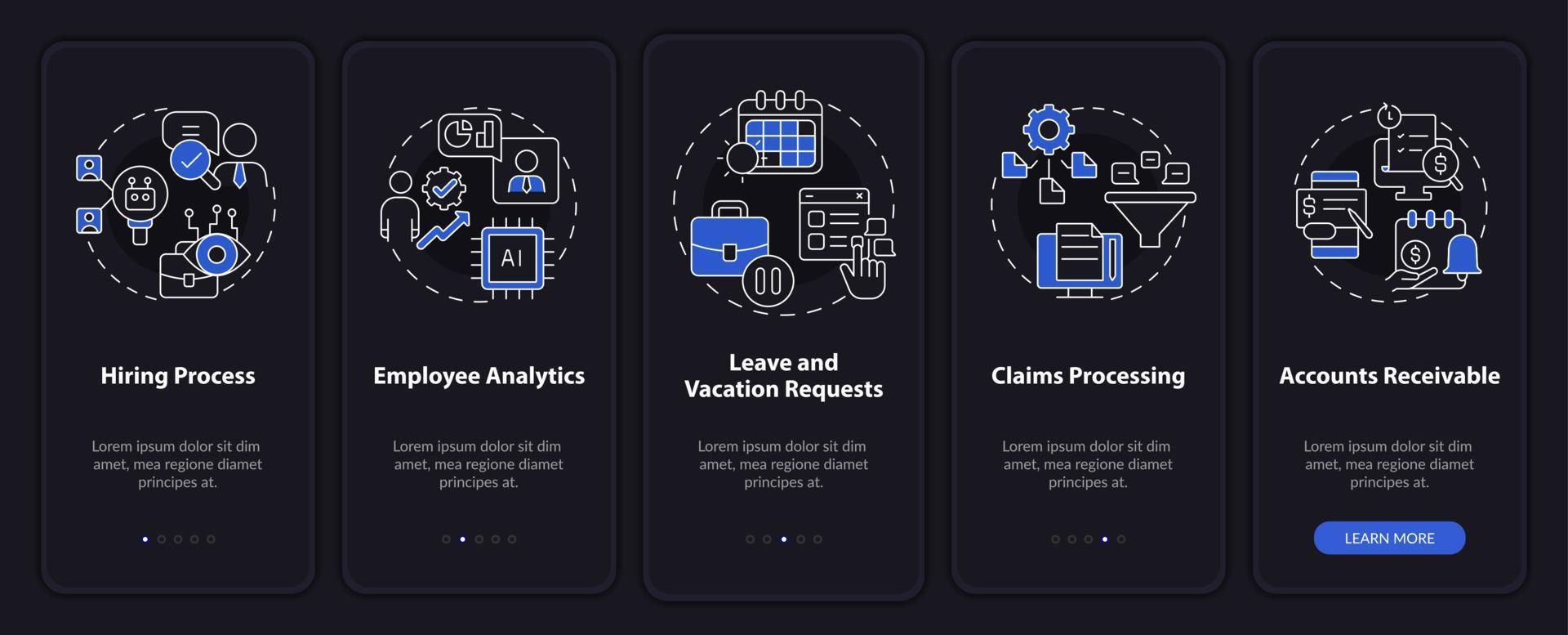 Automation in business examples night mode onboarding mobile app screen. Walkthrough 5 steps graphic instructions pages with linear concepts. UI, UX, GUI template. Pro Vector