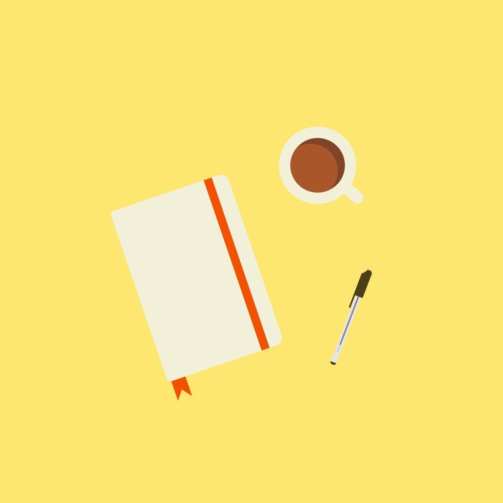 top view of empty blank notebook, coffee and pen on desk Free Vector