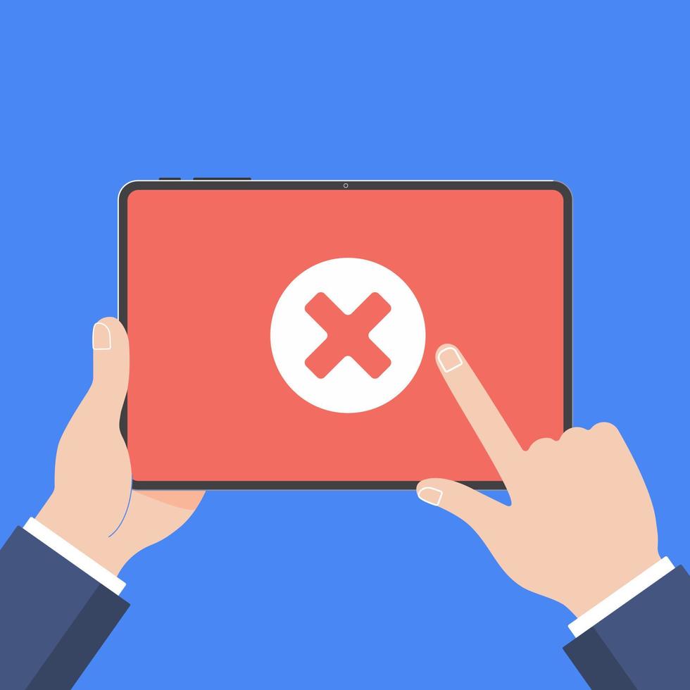 Hand holding black tablet PC device isolated on background. Pad computer on human's hands with check mark cross x NO in the circle and index finger pointed touch flat design vector illustration Pro Vector