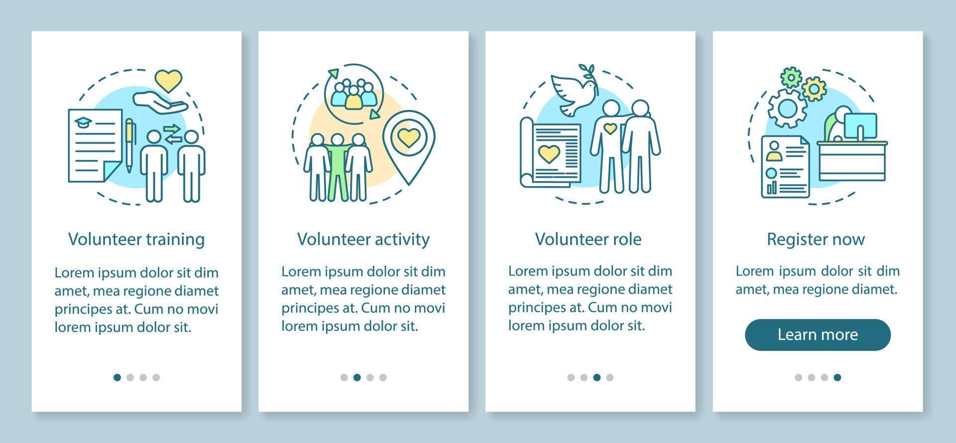 Volunteer becoming onboarding mobile app page screen vector template. Humanitarian help. Volunteer service walkthrough website steps with linear illustrations. UX, UI, GUI smartphone interface concept Pro Vector
