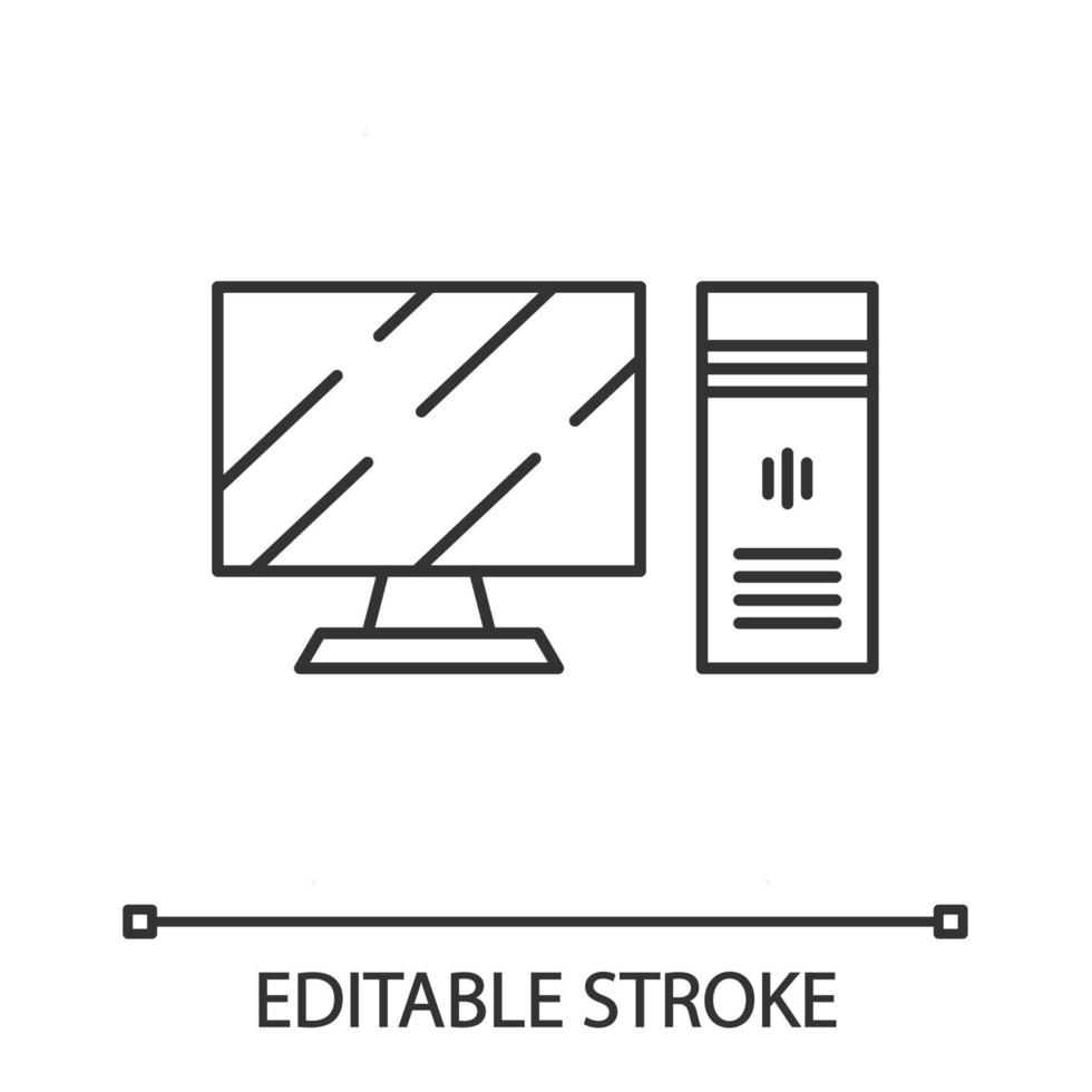 Gaming computer and monitor linear icon. Esports hardware. Video game devices. Desktop computer. Thin line illustration. Contour symbol. Vector isolated outline drawing. Editable stroke Pro Vector