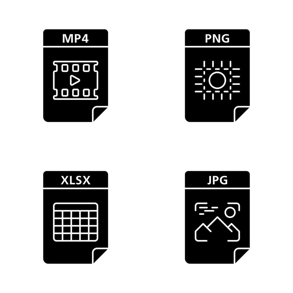 Files format glyph icons set. Multimedia, image, spreadsheet files. MP4, PNG, XLSX, JPG. Thin line contour symbols. Isolated vector outline illustrations. Editable stroke Pro Vector