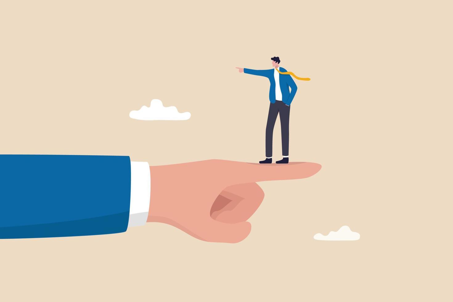 Employee conflict direction, argument between coworker, different thought, disagreement or opposite way, decision issue concept, tiny businessman standing on giant hand pointing in opposite direction. Pro Vector
